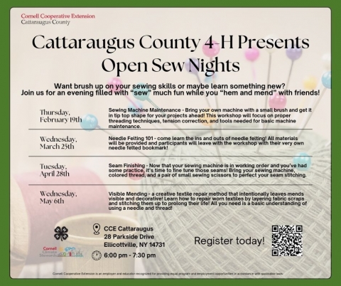 Register by visiting: https://reg.cce.cornell.edu/cattaraugusopensew_258 or calling 716-699-2377. All workshops will be held at CCE Cattaraugus, 28 Parkside Drive, Ellicottville, NY 14731 from 6:00 pm – 7:30 pm.